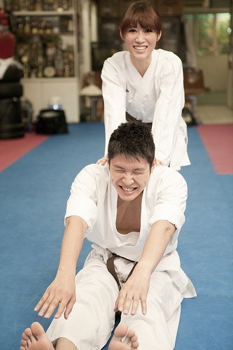 (老公的筋曾被教練虧說:大概是80歲的阿伯,因此拉筋是很重要的課題之一^^瞧他臉上的表情有多”猙獰”啊!)